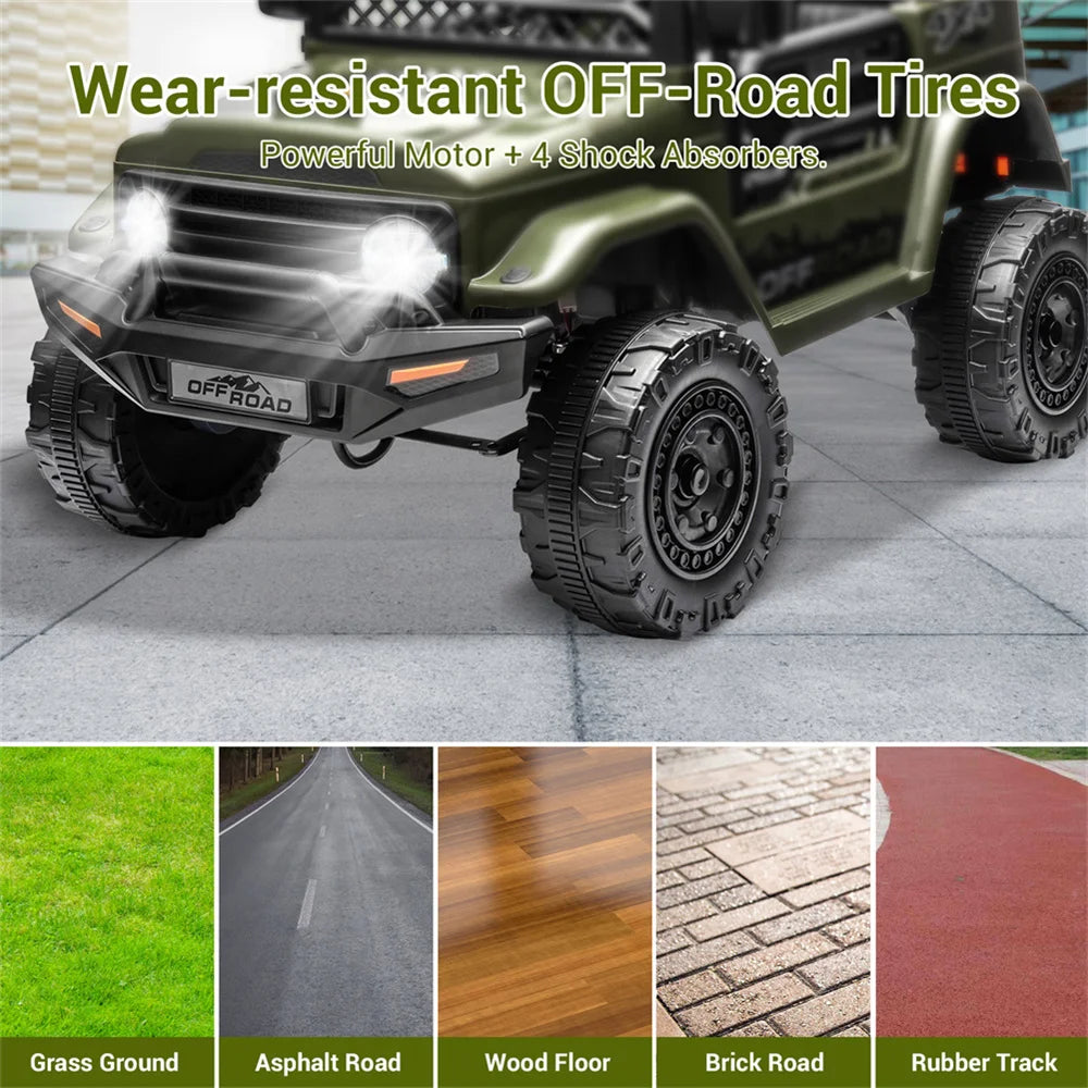 - Shared thrills on a stable chassis: Two seats and a built-in 12V electric drive deliver exciting adventures while sturdy four-wheel suspension provides steady handling on driveways, lawns, and smooth indoor floors.
